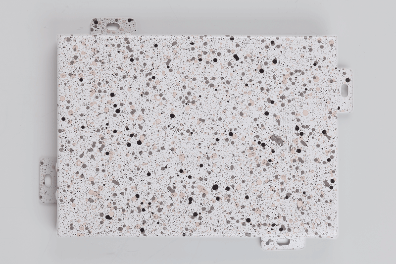 仿石纹氟碳铝单板的主要特征是铝单板表面逼真的石纹色,装饰效果喜人,且质量轻、安装方便,几乎可以替代大理石这种幕墙材料。它主要通过热转印等工艺,把石纹色转印到铝板表面,然后再喷上氟碳罩光漆,经过多次喷涂和烘烤,终客户定制的石纹效果。